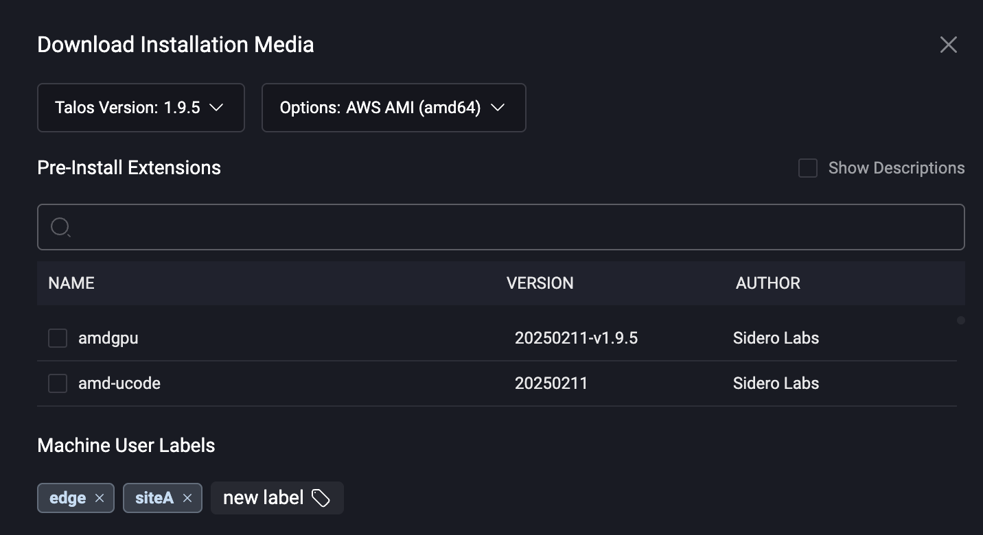 After a machine boots from the labeled media/PXE URL and registers with Omni, you can verify the labels using the Omni web interface or theomnictl