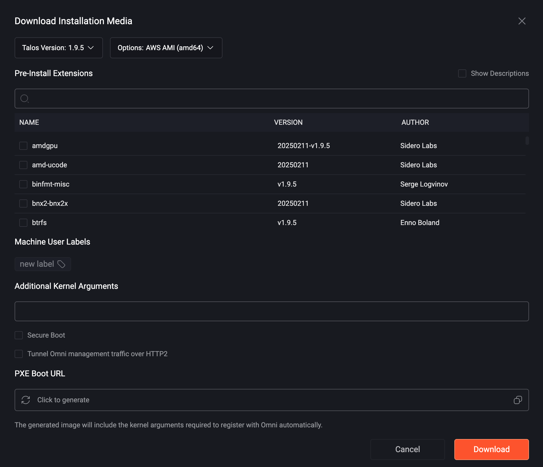 - Generating iPXE boot URLs: if your machines can boot via iPXE, you can configure them to boot directly off Omni via the Image Factory integration. Simply click to generate the PXE Boot URL, and pass that in to your systems to boot from.