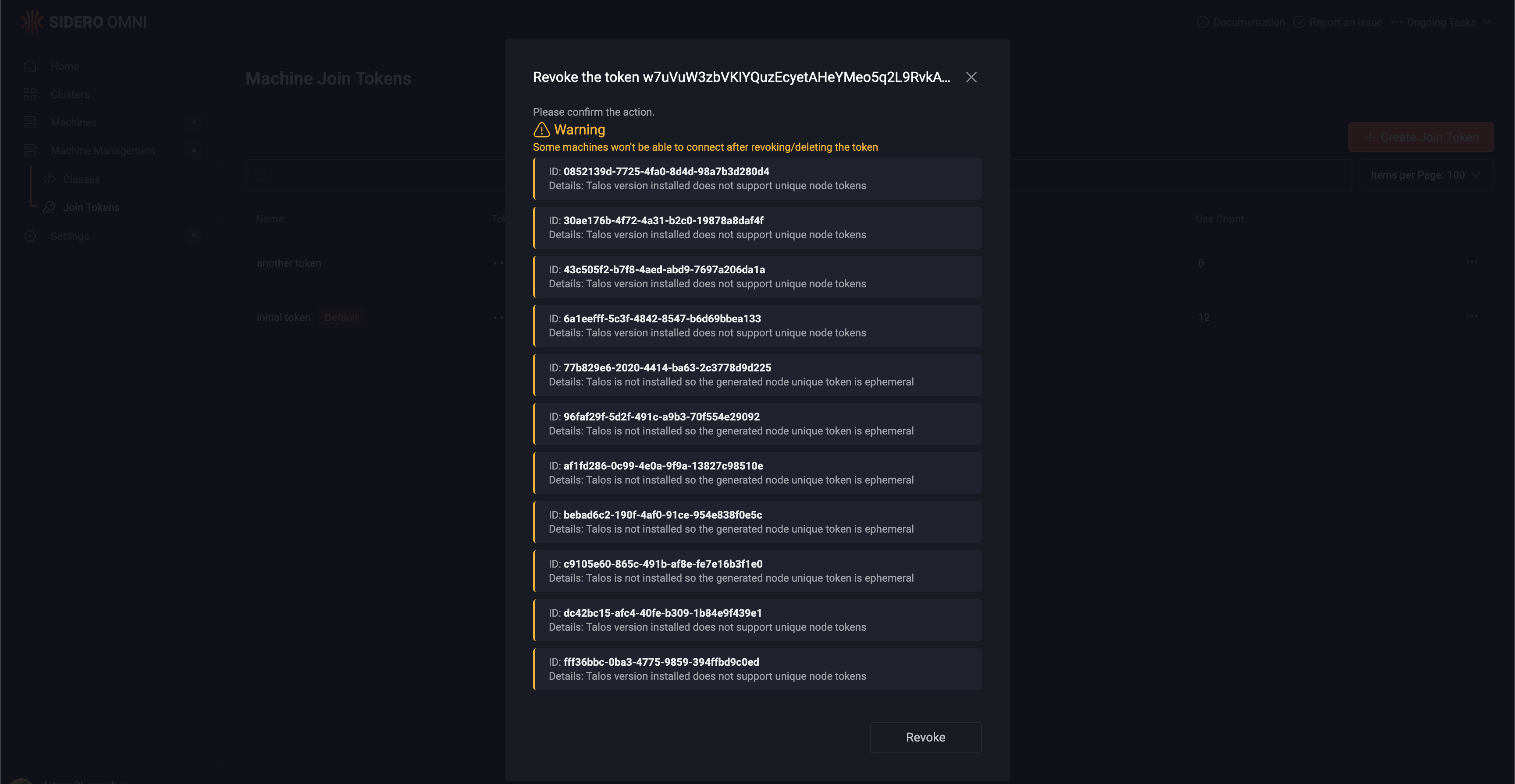 When a machine connects to Omni for the first time, it uses a join token specific to the Omni account that is shared by all new hosts that are registering with Omni. Omni then creates a unique, ephemeral token for each machine, and when Talos is installed to disk, that token is persisted to disk. If the shared token is revoked, machines that have persisted unique tokens (i.e. those with Talos installed to disk) will stay connected, but machines using only shared tokens will be disconnected.Talos < 1.6 doesnât support unique tokens.
