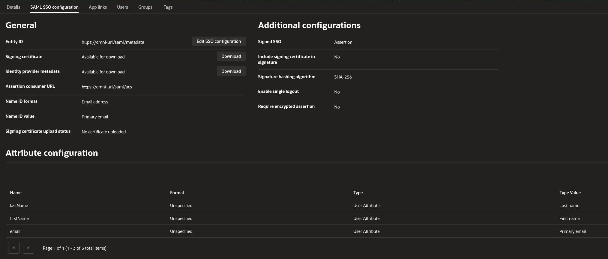 On the left menu, select Identity & Security > Domains. Click your desired domain, then select Integrated Applications. Click Add Application > SAML Application > Launch Workflow. Give the application a name (“Omni” for example) and leave all other fields blank. Select Submit. Select the created application, then click SAML SSO Configuration > Edit SSO Configuration. We can now define our application configuration. Only update the fields mentioned in the table below.| Option | Value | Description |