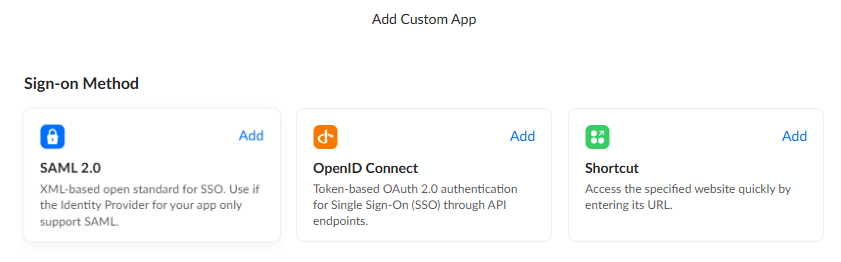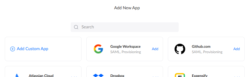 This section describes how to use Unifi Identity Enterprise (here forward UIIE) SSO with Omni via SAML First, login to the UIIE Manager portal and navigate to the SSO Apps section in the left menu. Next, Add a new app. Choose âAdd Custom Appâ