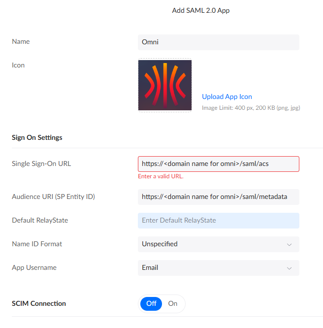 Single Sign-On URL | https://<fqdn for omni>/saml/acs | The fully-qualified domain name at which your omni instance will reside |