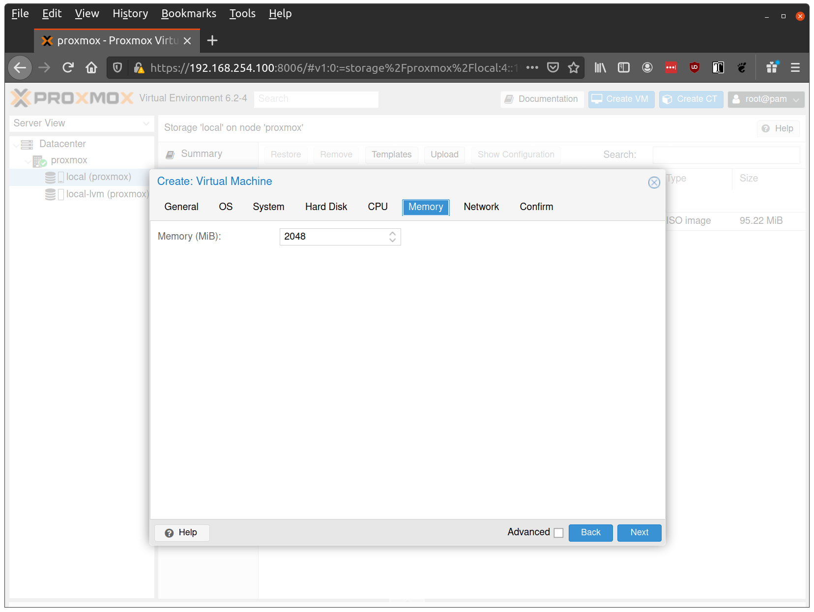 From the Proxmox UI, select the “local” storage and enter the “Content” section. Click the “Upload” button:
